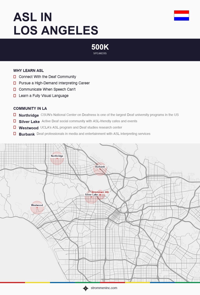 Los Angeles has a large and active Deaf community with deep roots. The Greater Los Angeles Agency on Deafness (GLAD) has been operating since 1969. Gallaudet University’s west coast hub is here. Deaf events, meetups, and social gatherings happen regularly across the city — from Deaf coffee chats in Silver Lake to community nights in the Valley. The entertainment industry has also driven demand for ASL in LA: interpreters work at concerts, live events, and on film sets, and the visibility of Deaf actors and performers has grown significantly in recent years. Many Angelenos learn ASL to communicate with Deaf family members, to work in education or healthcare, to pursue interpreting careers, or simply because they’re drawn to a language that operates in an entirely different modality than anything they’ve experienced before.