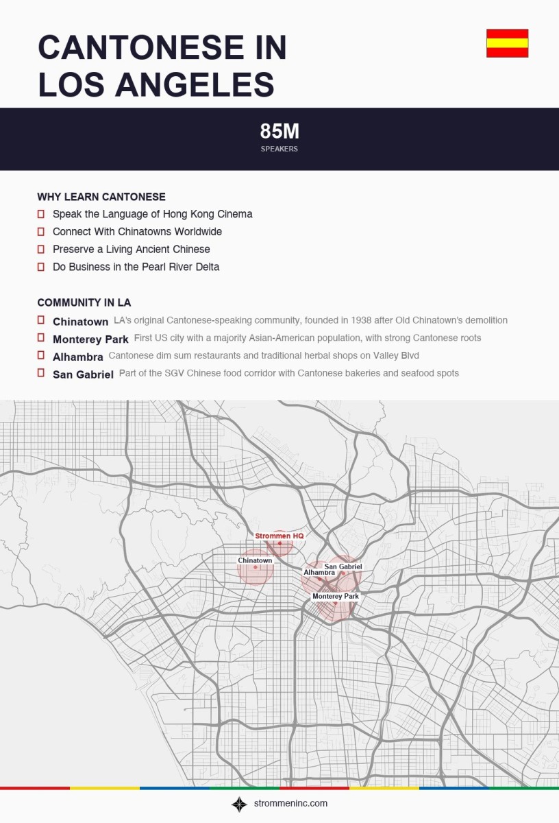 Cantonese is spoken by roughly 85 million people worldwide, primarily in the Guangdong province of southern China, Hong Kong, Macau, and a massive global diaspora. It’s one of the major Chinese languages, distinct enough from Mandarin that the two are not mutually intelligible when spoken. Cantonese has six to nine tones depending on the analysis (compared to Mandarin’s four), making it one of the more phonetically demanding languages out there. It’s also the language behind Hong Kong cinema, Cantopop, classic kung fu movies, and dim sum culture. While Mandarin gets more attention as China’s official standard language, Cantonese remains the dominant spoken language in many overseas Chinese communities — and LA’s is one of the biggest.