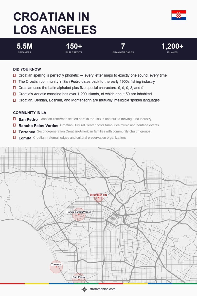Strommen has been teaching Croatian in Los Angeles since 2006, and our founder has deep personal ties to the language — the company has over 150 film and entertainment credits, many involving Croatian language coaching. Our native-speaking tutors focus on real conversation from day one. Croatian grammar is complex, but our tutors make it approachable by teaching through usage and context, not abstract charts. Whether you are reconnecting with your Croatian heritage, preparing for an extended stay on the Dalmatian coast, or building professional relationships in Zagreb, lessons are tailored to you. One-on-one, online or in person.
