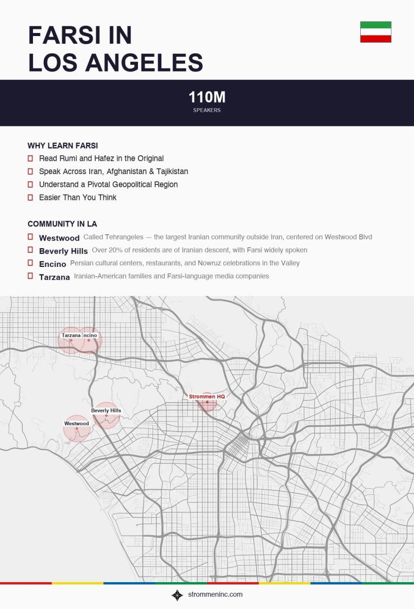 Westwood’s “Tehrangeles” corridor is the symbolic heart of LA’s Iranian community — the largest outside of Iran. Persian businesses, restaurants, and cultural institutions line Westwood Boulevard south of Wilshire. Beverly Hills has a significant Iranian-American population and has even had Iranian-American mayors. Encino and Tarzana in the Valley round out the geography. For many families, Farsi is the language spoken at home but slipping away with the younger generation. Heritage speakers make up a large share of our students, alongside professionals building ties with Iran and its diaspora and students drawn in by Persian literature and culture.