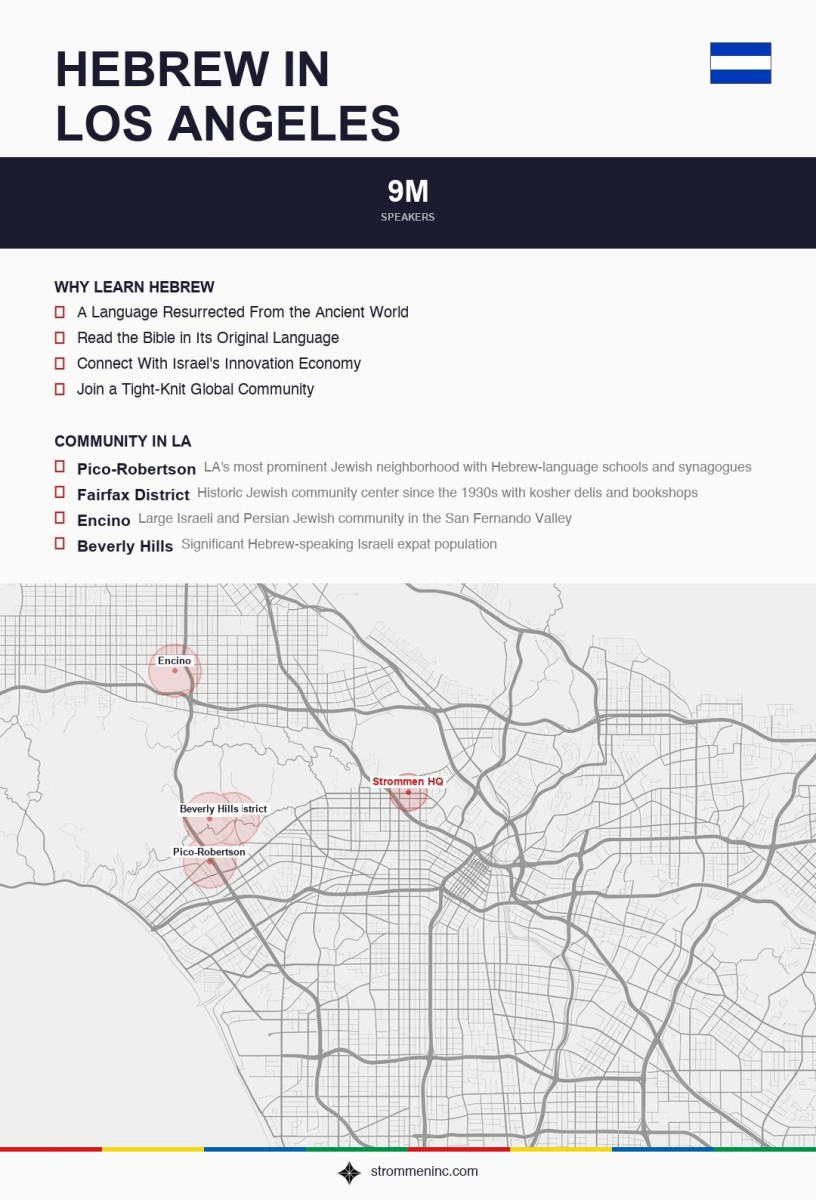 Los Angeles has one of the largest Israeli expat communities in the world, sometimes called the second-largest Israeli city outside Israel. Pico-Robertson is the historic center, with kosher restaurants, Hebrew-language bookstores, and synagogues where Hebrew is the primary spoken language. The Fairfax District carries its own history. Encino and Tarzana in the San Fernando Valley have large Israeli populations — walk through the shopping centers and you’ll hear Hebrew as often as English. For many Angelenos, Hebrew connects to family, religious practice, travel, or business ties with Israel.