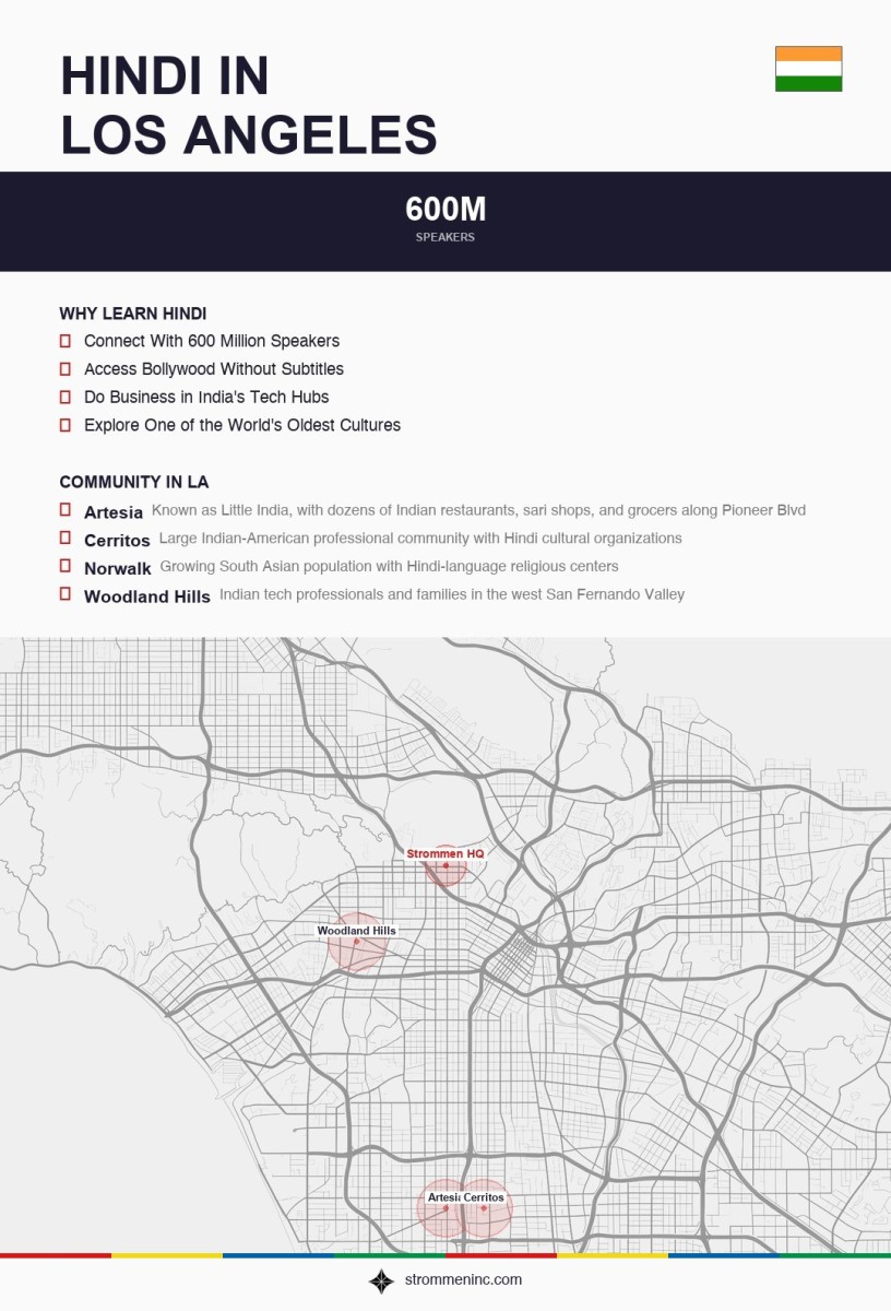 The Indian-American community in LA is one of the largest in the country. Artesia’s Pioneer Boulevard — known as Little India — is lined with sari shops, sweet stores, and restaurants serving regional cuisines from Punjab to Tamil Nadu. Cerritos and the surrounding communities have a large concentration of Hindi-speaking families. In tech corridors from Playa Vista to Pasadena, Hindi is a workplace language. Heritage speakers — kids who grew up hearing Hindi at home but went to school in English — make up a significant portion of our students. So do Bollywood fans who want to watch films without subtitles.
