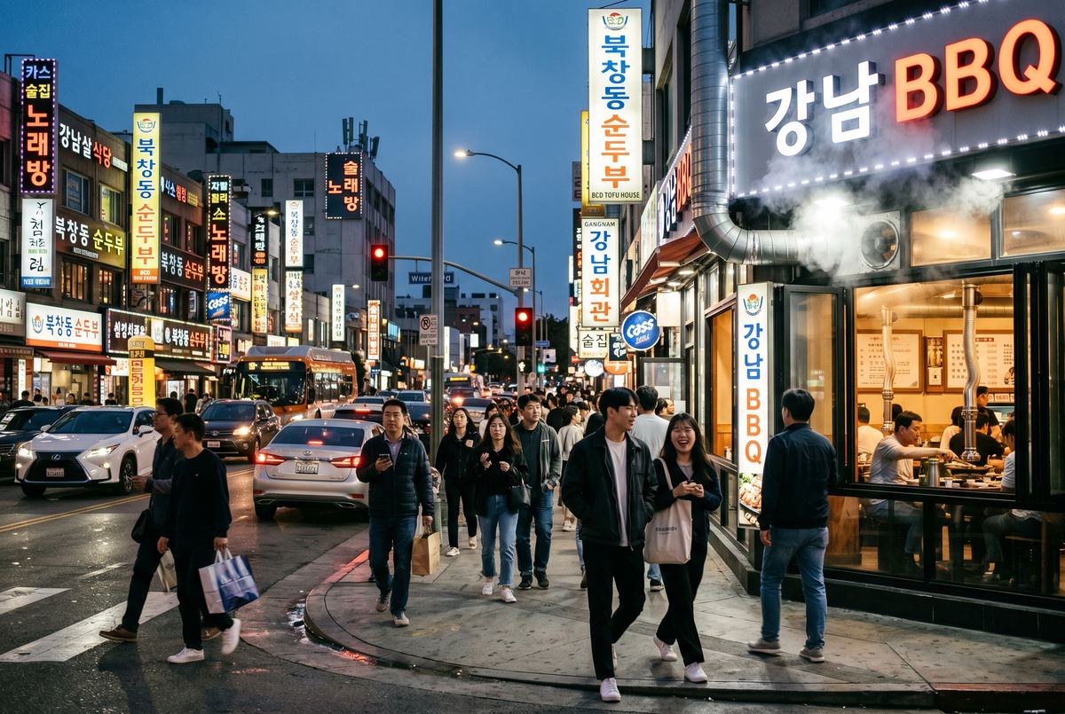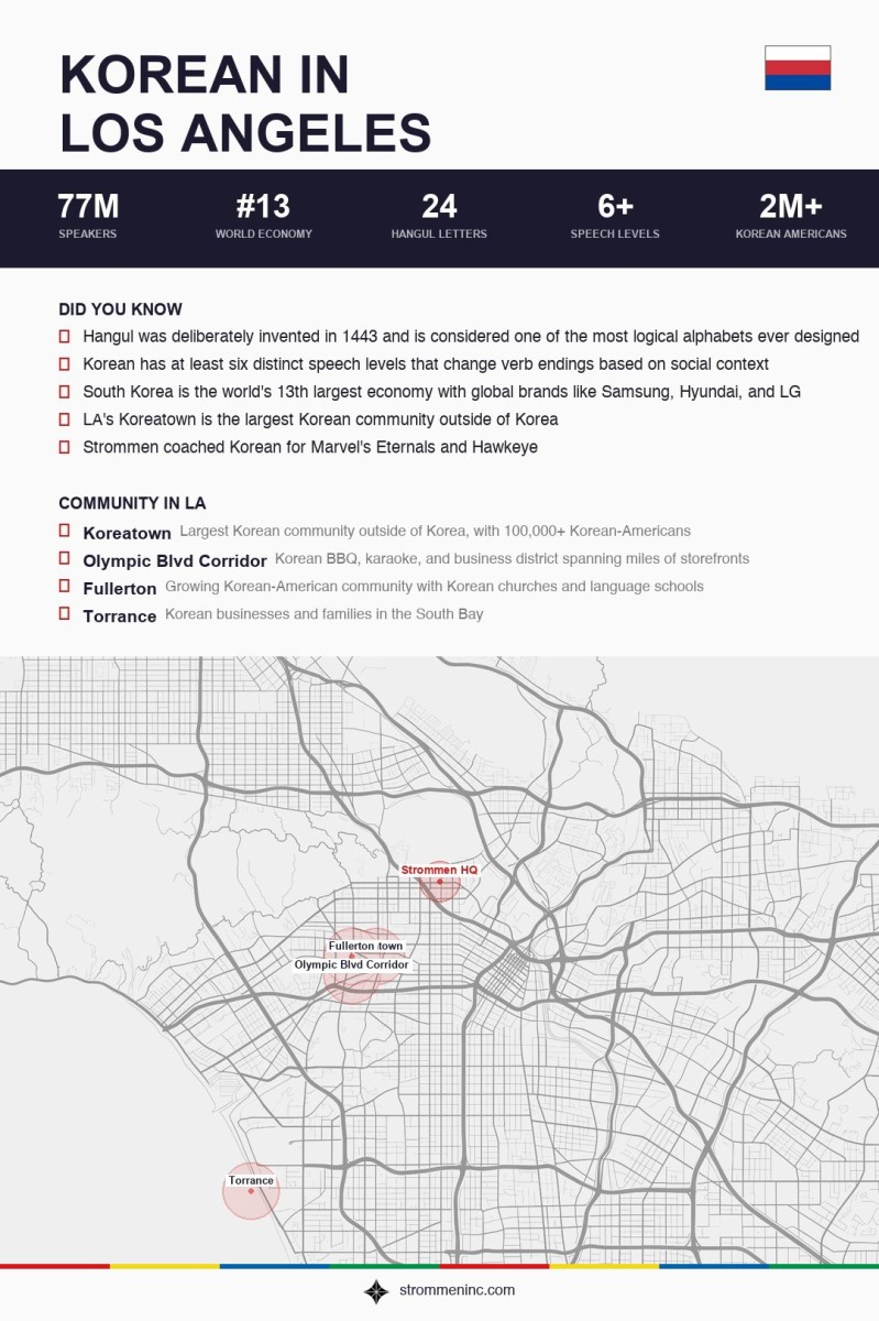 Los Angeles has the largest Korean population outside of Korea. Koreatown — bounded roughly by Wilshire, Olympic, Western, and Vermont — is not a quaint ethnic enclave. It is a city within a city: Korean-language banks, hospitals, law firms, karaoke rooms, restaurants open until 3 AM, and newspapers that cover local LA politics entirely in Korean. The community extends well beyond K-Town into the San Fernando Valley, Fullerton, and Irvine. Korean cultural influence in LA runs far beyond the Korean-American community. K-pop, K-drama, Korean skincare, and Korean barbecue have become mainstream. Strommen has coached Korean for Marvel productions including Eternals and Hawkeye, working with cast members on pronunciation and delivery.