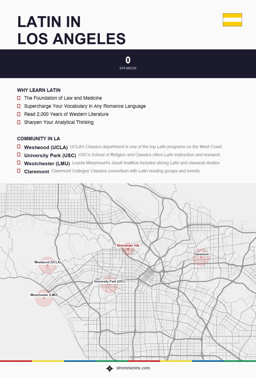 In Los Angeles, Latin tends to come up in two contexts. The first is students — high schoolers and college students who need Latin for AP exams, pre-med prerequisites, or graduate school reading requirements. UCLA, USC, Loyola Marymount, and a number of Catholic high schools in the LA area require or offer Latin, and many students need supplementary tutoring to keep up. The second group is adults who come to Latin by choice: lawyers who want to actually understand the phrases they use daily, writers interested in etymology, classicists, Catholics who want to follow the Tridentine Mass, or people who just find the language beautiful and want to read Virgil or Cicero in the original.