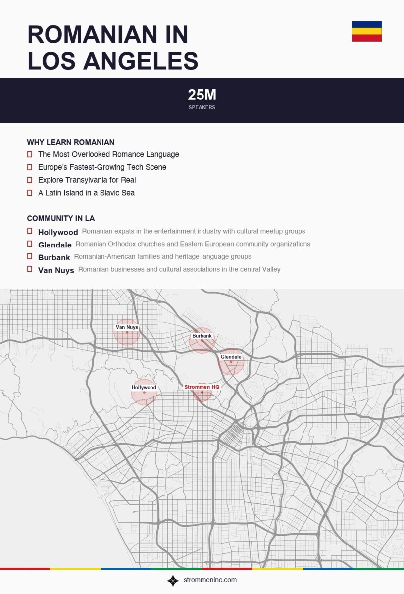 LA’s Romanian community is concentrated in the San Fernando Valley, particularly around Glendale, Van Nuys, and North Hollywood. There are Romanian Orthodox churches, cultural associations, and a handful of restaurants and bakeries scattered through the Valley. The community grew significantly in the 1990s and 2000s as Romanians emigrated after the fall of communism. Many learners are second-generation kids reconnecting with the language, or Americans married into Romanian families. Others need it for business — Romania has become a serious tech hub in Europe, and EU-related work sometimes requires it.