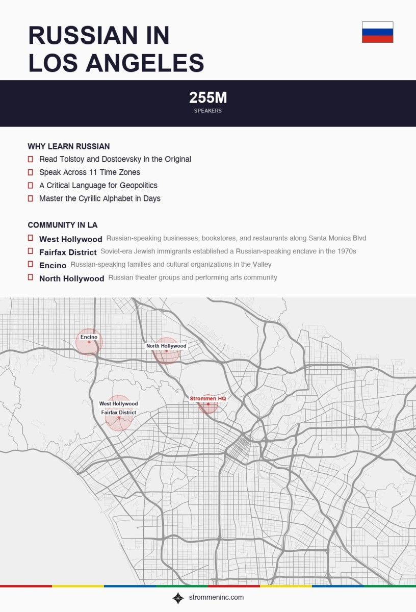 LA has had a Russian-speaking community since the early 1900s, but the biggest wave came in the 1970s through 1990s when Soviet Jews emigrated to the US. West Hollywood — particularly the stretch along Santa Monica Boulevard and Fairfax — became known as “Little Russia” or “Little Odessa West.” Russian delis, bookstores, and restaurants still line those blocks. There are also significant Russian-speaking populations in the Valley, Glendale, and parts of the Westside. Beyond heritage speakers, a lot of Angelenos learn Russian for business, diplomacy, tech (Russian developers are everywhere), literature, or because they married into a Russian family and want to keep up at the dinner table.