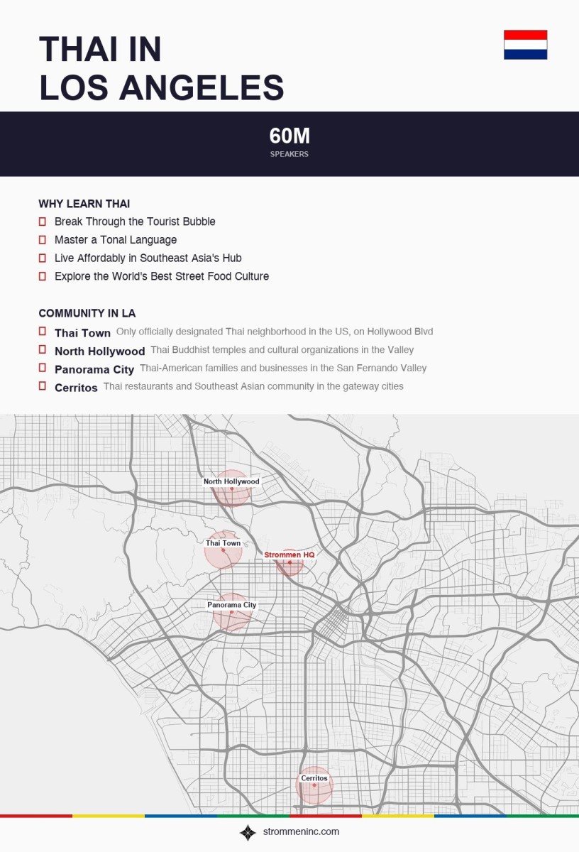 LA has the only officially designated Thai Town in the United States, centered on Hollywood Boulevard between Normandie and Western. It’s been a cultural hub since the 1960s when Thai immigrants began settling in the area, and it became an official neighborhood in 1999. The stretch is packed with restaurants — Jitlada, Ruen Pair, Pa Ord — that draw food obsessives from all over the city. Beyond Thai Town, Thai grocery stores, temples like Wat Thai in North Hollywood (where the Sunday food market is a weekend institution), and community organizations keep the culture visible across the Southland. Many Angelenos start learning Thai because they fell in love with the food, traveled to Bangkok or Chiang Mai, or are dating someone Thai and want to communicate with their family. The entertainment and hospitality industries in LA also employ Thai speakers in various roles.