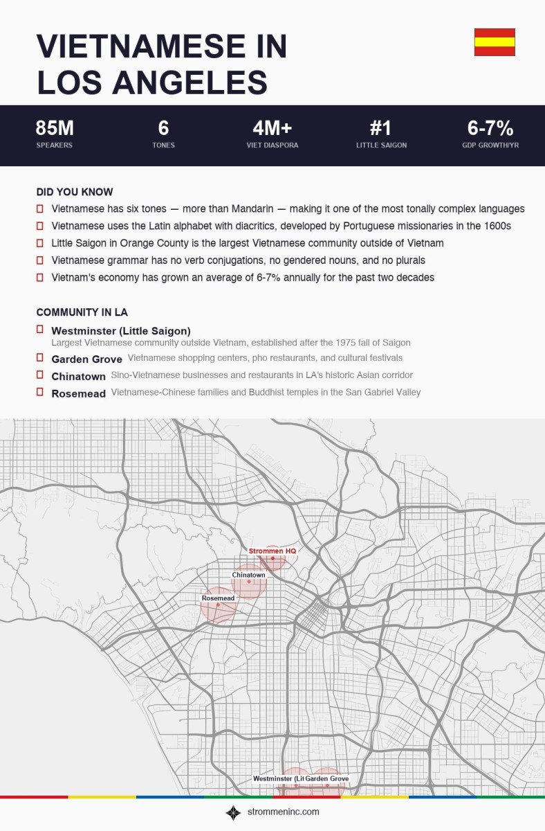 Westminster and Garden Grove are home to the biggest Vietnamese commercial district outside of Vietnam. Speaking Vietnamese here is not an academic exercise — it is how half the neighborhood operates.