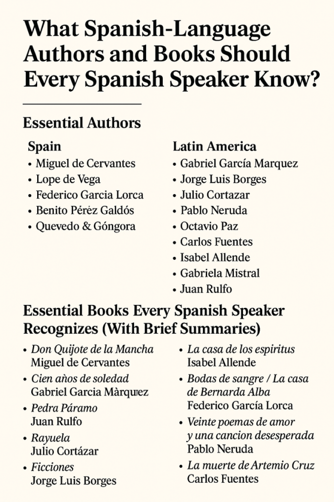 Every Spanish speaker is generally expected to recognize the major authors and classic works from Spain and Latin America, especially those taught in school and referenced constantly in culture—such as Cervantes, García Márquez, Borges, Cortázar, Lorca, Neruda, and Allende.